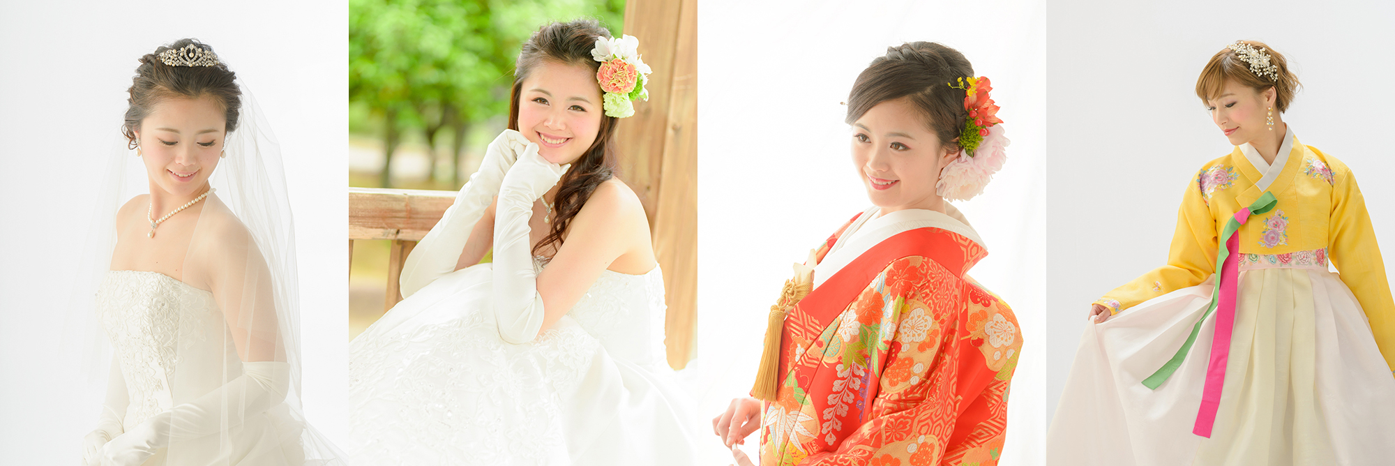 和装やドレスのブライダルヘアメイクをさせていただく機会の方が多いのですが、代表は韓国にルーツを持っており、韓国式ウエディングのヘアメイクやお衣装全般のサポートも可能です。在日の方・韓国人のパートナーをお持ちの方で、韓国式のスタイルを取り入れた挙式を検討しているものの「やりたいけどよく分からない」という方には、韓国式の伝統的なスタイルについてのアドバイスも可能。出張も致しますので、東海エリア以外の方もどうぞご相談ください。